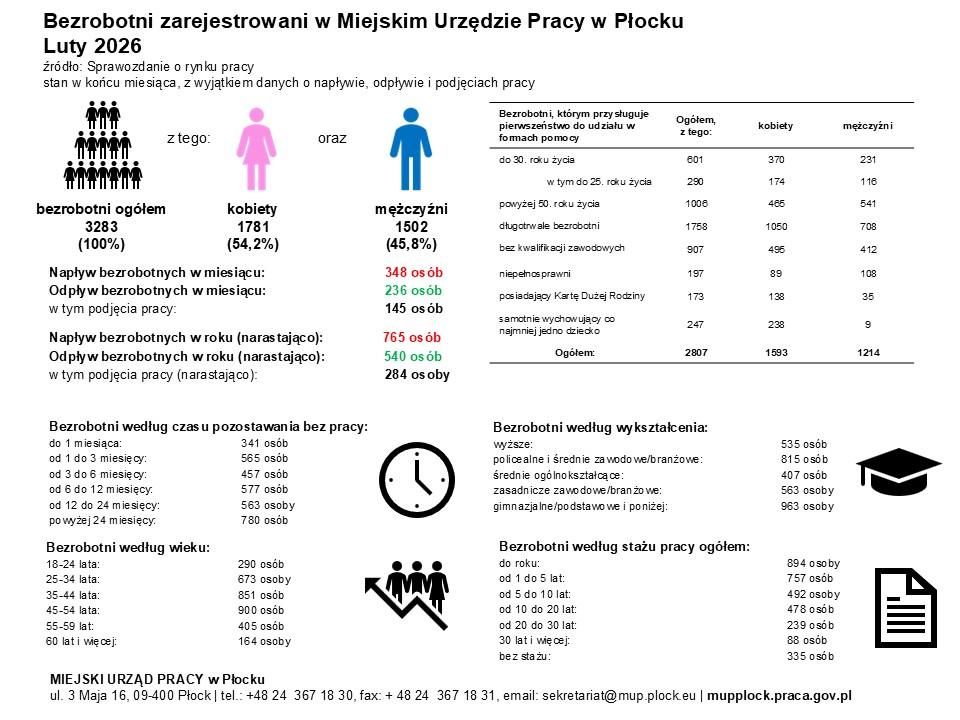 Informacja graficzna o strukturze osób bezrobotnych zarejestrowanych w Miejskim Urzędzie Pracy w Płocku - luty 2026