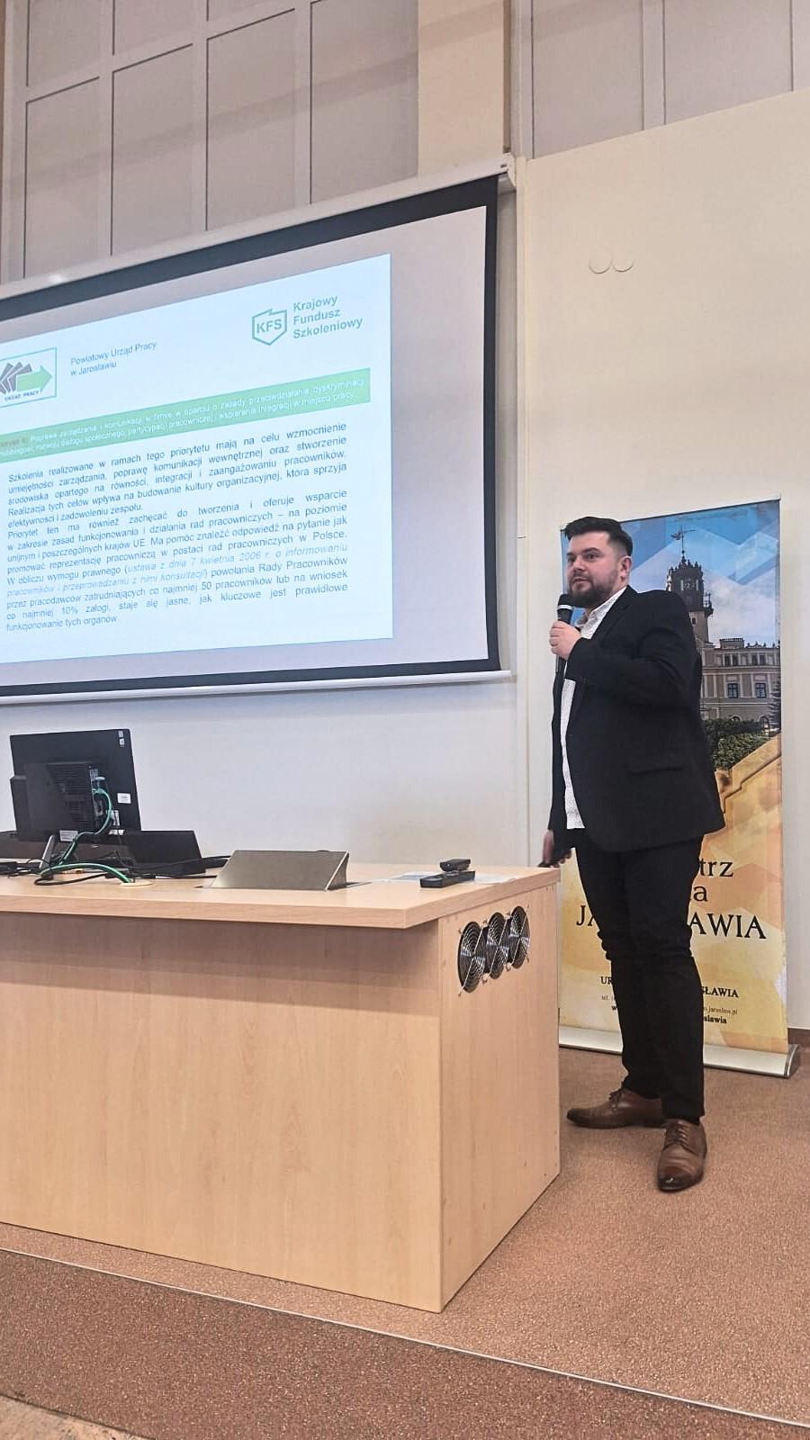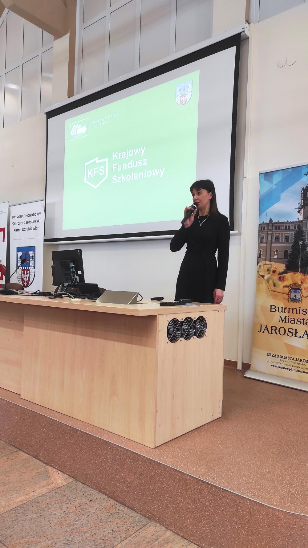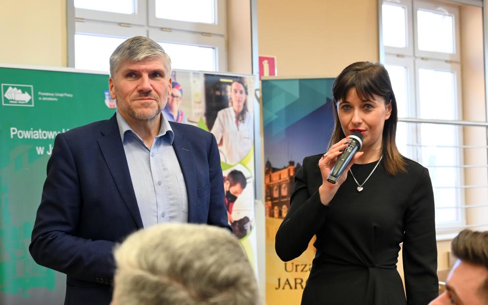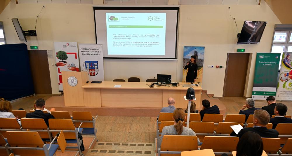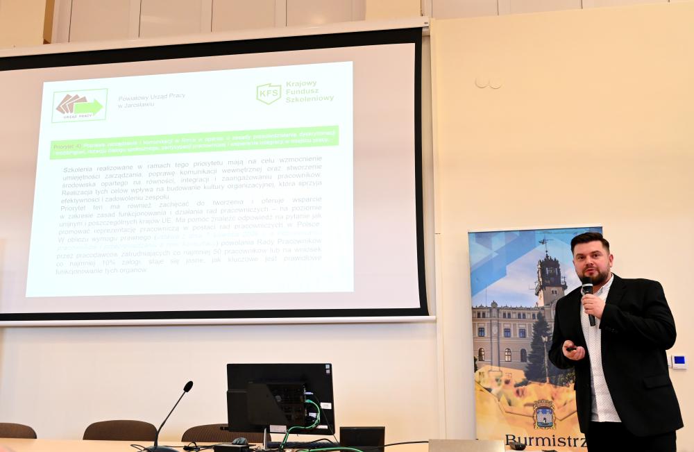 Uczestnicy spotkania mieli możliwość wysłuchania czterech prelekcji. Pani Paulina Janda-Sarnecka zaprezentowała możliwości wsparcia oferowane przez Polską Agencję Inwestycji i Handlu. Pan Mirosław Szczęśniak przedstawił ofertę wsparcia finansowego w rozwijaniu biznesu z Banku Gospodarstwa Krajowego. Pani Ewelina Olejarz Dyrektor Powiatowego Urzędu Pracy w Jarosławiu oraz Pan Jakub Limowski Kierownik Referatu Obsługi Klienta Instytucjonalnego przybliżyli temat wsparcia w ramach Krajowego Funduszu Szkoleniowego, omawiając szczegółowo finansowane w bieżącym roku priorytety. Pani Magdalena Dec-Kiełbasa – Kierownik Agencji Zatrudnienia Wspomaganego dla osób z Niepełnosprawnościami – Centrum DZWONI przy Polskim Stowarzyszeniu na rzecz Osób z Niepełnosprawnością Intelektualną Koło w Jarosławiu omówiła bezpłatne usługi w zakresie aktywizacji zawodowej i społecznej osób z niepełnosprawnością opierającej się na europejskim modelu zatrudniania wspieranego.